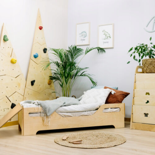 Montessori lav seng i tre + sklie med klatreside, barneseng, (70cm x 140cm) juniorseng. Fri frakt